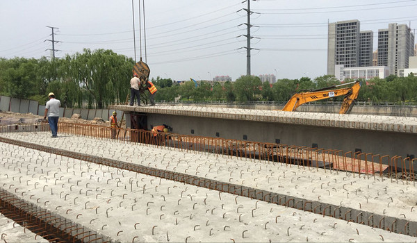 5月18日上午9時,濱河南路拓寬改造工程第一塊T型板梁正式開始吊裝。該橋設計寬26米,橋跨18米,橋型為一跨簡支變截面肋梁橋,主梁采用裝配式后張預應力混凝土變截面T梁,吊裝后濕接。經過連續不間斷作業,于下午16時圓滿完成七塊主梁、兩塊邊梁,共計九塊板梁的吊裝任務,比原計劃提前一天,至此標志著橋梁主體結構工程順利完成。為保障此次吊裝作業的順利進行,項目部科學部署,精心組織,提前策劃,并與交警等相關部門充分溝通,確定合理的運輸路線和時間。項目部設立吊裝安全保障小組、明確責任分工;詳細制定切實可行的施工方案,做到以方案指導施工;認真做好各項施工前準備工作:包括技術準備、機械設備準備、勞動組織準備、施