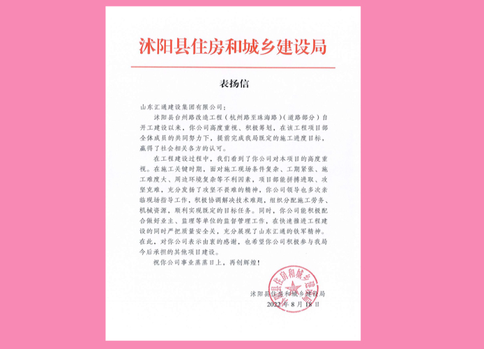 近日,沭陽縣住房和城鄉建設局向匯通公司發來表揚信,對沭陽縣臺州路改造工程項目部面對工期緊、管線障礙多、周邊環境復雜等不利因素,科學調度周密組織,嚴把工程質量安全關,提前完成進度目標給予高度肯定。 沭陽縣臺州路改造工程項目部將充分發揚鐵軍精神,高標準高質量完成后續施工任務,向沭陽縣廣大市民交上一份滿意答卷,為沭陽縣后期項目建設夯實基礎。