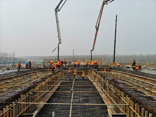 余寒漸消,大地春回,匯通公司沭陽快速路二期(威海路段)工程全面吹響項目建設大干號角。 沭陽縣城區快速路二期工程施工圖設計威海路(臺州路-義烏路),全長4.162千米,造價4.65億元,起點順接現狀威海路(臺州北路交叉口西側),向東沿沂南河大堤至義烏路后折向南,終點位于蕭山路交叉口。快速主線采用雙向六車道;兩側地面輔道采用雙向4車道,主線上跨橋上部結構采用預應力連續梁,全長1406.9米,橋面寬25.5米,單箱三室斜腹板箱梁,下部結構采用“H”型框架墩,群樁基礎。本項目的建設是沭陽中心城區的主干路“十橫十縱”結構的重要一環,有利于完善快速交通功能、促進綜合交通體系發展、推動地區經濟發展、提升