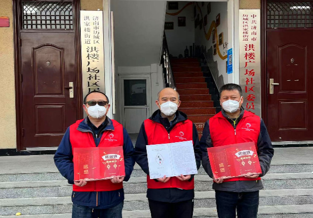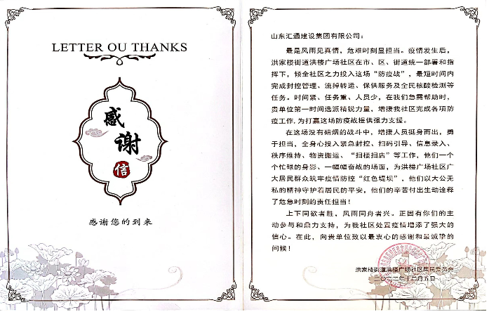 “抗疫奮戰(zhàn) 堅(jiān)守一線 共駐共建 情暖民心” 。12月5日,洪樓廣場(chǎng)社區(qū)黨支部書(shū)記尹延偉給集團(tuán)匯通公司下沉社區(qū)服務(wù)隊(duì)送來(lái)錦旗和感謝信,表達(dá)了對(duì)志愿隊(duì)在此次抗擊疫情期間不分晝夜、義無(wú)反顧堅(jiān)守一線的高度贊揚(yáng)和誠(chéng)摯謝意。